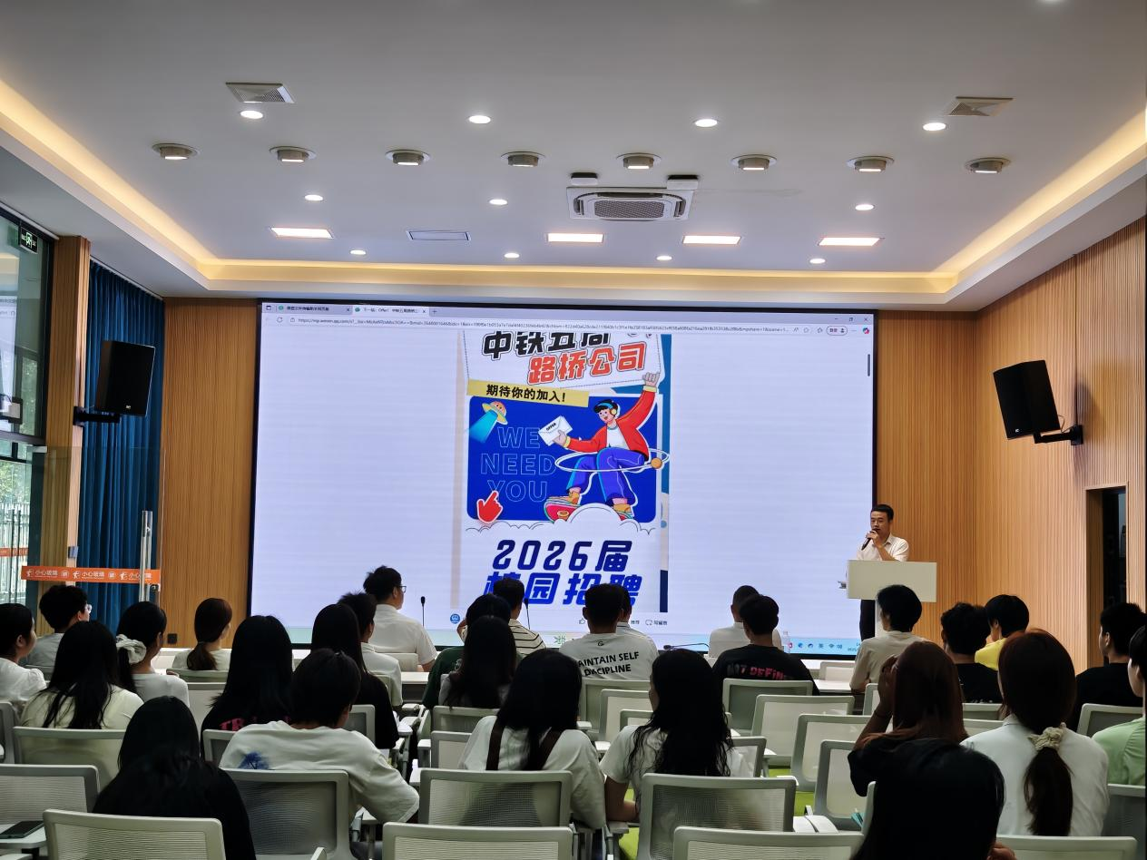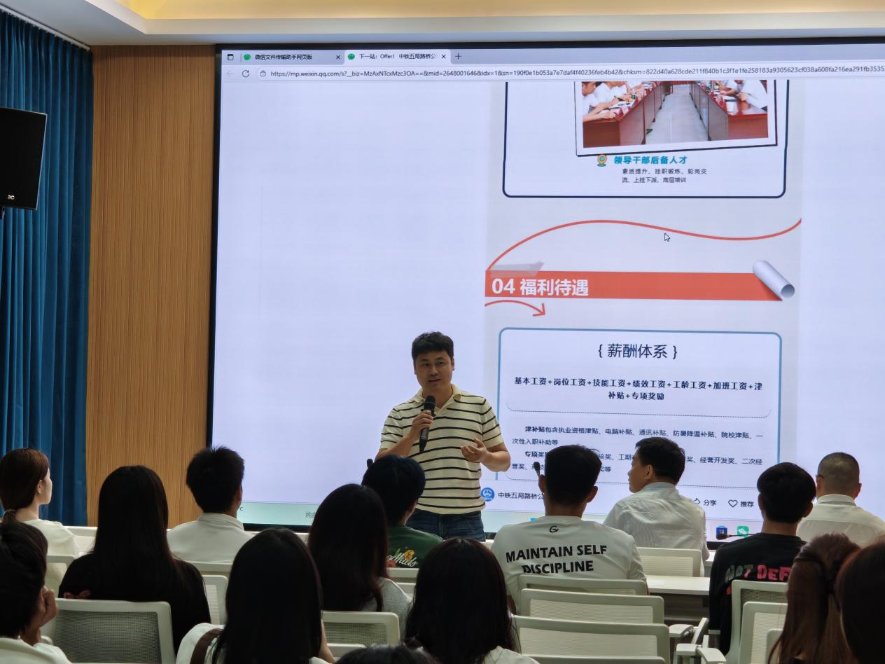 活动伊始,中铁五局路桥公司人力资源部副部长李志冬系统介绍了公司的发展历程、辉煌业绩、业务范围、企业文化以及此次招聘的岗位需求、薪资待遇和未来职业发展通道,让同学们对这家实力雄厚的国企有了全面深入的了解。在场同学也就工作环境、转正考核、职业晋升、待遇具体构成等关心的问题与招聘人员进行了交流。
