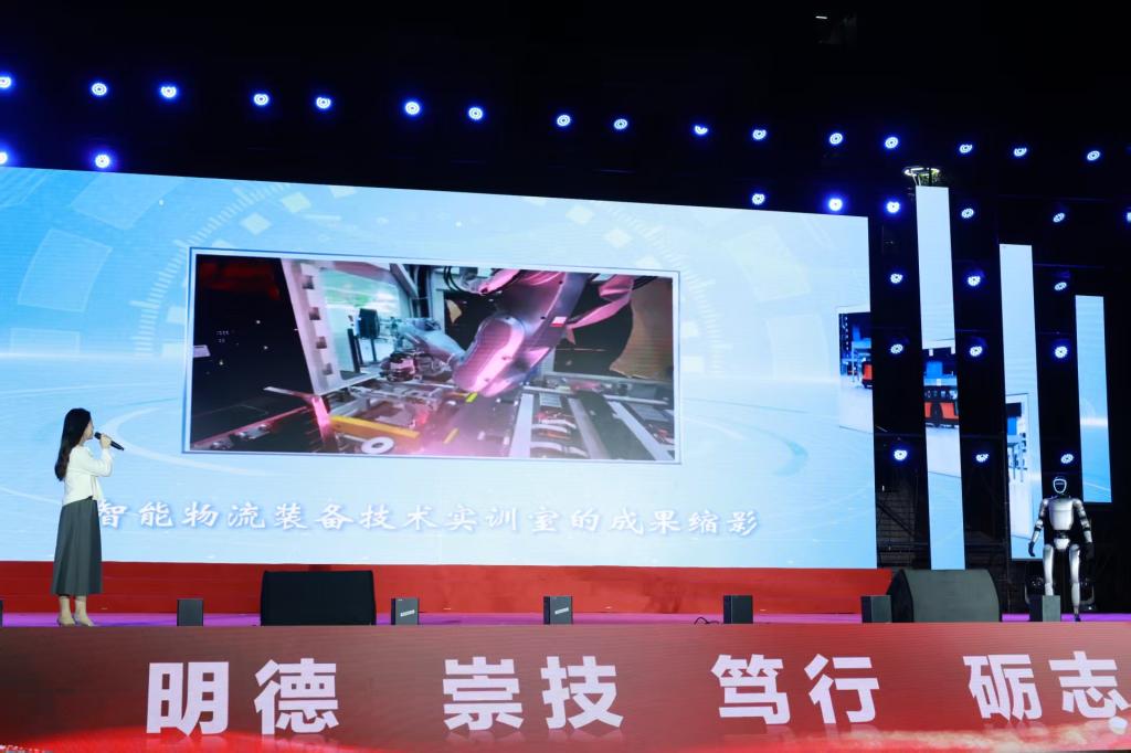 随后,节目巧妙过渡到专业展示环节。在背景大屏幕播放的精彩视频配合下,一段沉稳而清晰的解说响起,向全场师生和校友详细介绍了物流工程学院当前实训工场内的先进专业设备。从自动化立体仓库到智能分拣机器人,从无人机配送模拟系统到智慧供应链管理平台,一件件“硬核”设备的亮相,充分展示了学院雄厚的实践教学实力和紧跟行业发展的现代化办学条件,让在场的校友们赞叹不已,也让在校生倍感自豪。